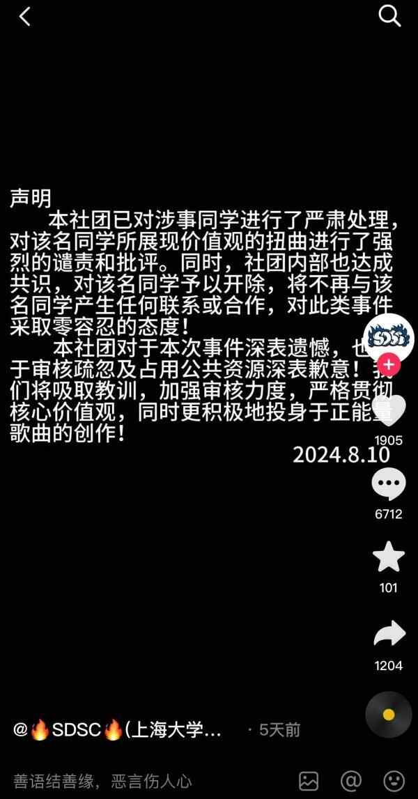 抖音平台上,一名为“SDSC(上海大学说唱社)”的账号8月10日发布声明称:“本社团已对涉事同学进行了严肃处理,对该名同学所展现价值观的扭曲进行了强烈的谴责和批评。同时,社团内部也达成共识,对该名同学予以开除。”