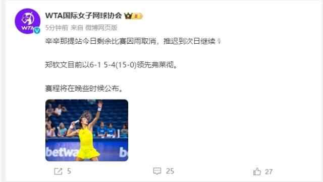 据WTA国际网球女子协会消息,辛辛那提站今日剩余比赛因雨取消,推迟到次日继续,郑钦文目前以6-1 5-4(15-0)领先弗莱彻。赛程将在晚些时候公布。