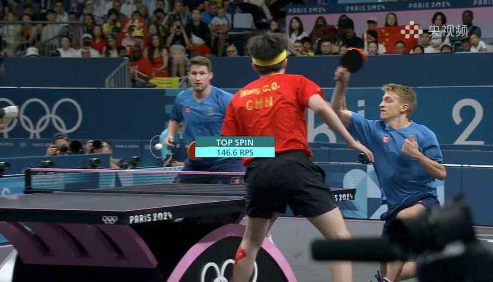 最大转速出现在乒乓球男团决赛第一场双打,瑞典人卡尔伯格打出的一记球,达到了每秒146.6转;其次是男单决赛,樊振东打出的一记球,达到了每秒146.48转。