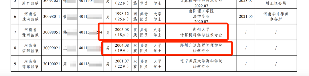 此前,在河南省监狱管理局此前公布的《河南省监狱系统2024年度统一考试录用公务员第二批拟录取人员名单》中,出生于2005年8月的韩某某,以及出生于2004年8月的王某某引起了网友关注。