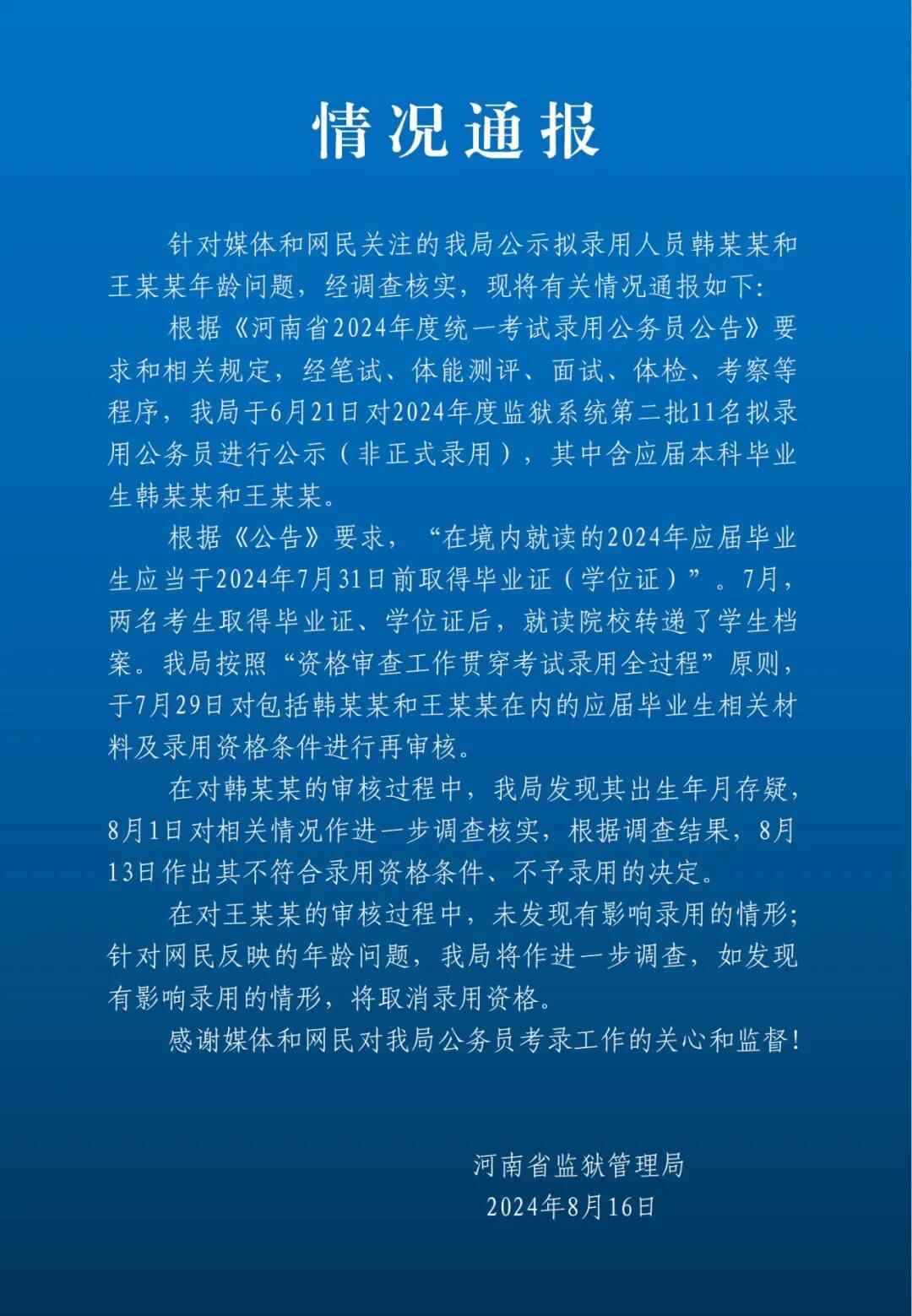 8月16日,河南省监狱管理局就该事件发布情况通报称,对韩某某作出不予录用的决定,王某某暂未发现有影响录用的情形,针对网民反映的年龄问题,将作进一步调查。通报全文如下: