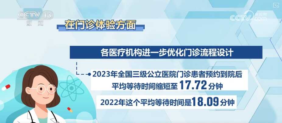 在门诊体验方面,各医疗机构进一步优化门诊流程设计。2023年全国三级公立医院门诊患者预约到院后平均等待时间缩短至17.72分钟,2022年这个平均等待时间是18.09分钟。
