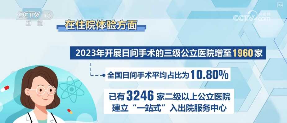 在住院体验方面,2023年开展日间手术的三级公立医院增至1960家,全国日间手术平均占比为10.80%。已有3246家二级以上公立医院建立“一站式”入出院服务中心。