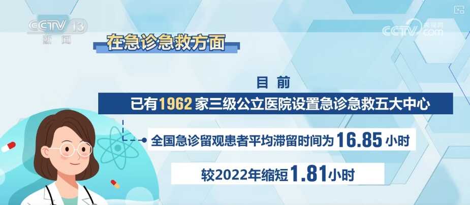 在急诊急救方面,目前,已有1962家三级公立医院设置急诊急救五大中心。全国急诊留观患者平均滞留时间为16.85小时,较2022年缩短1.81小时。
