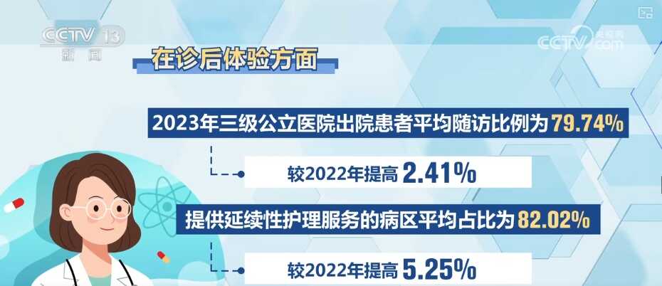 在诊后体验方面,2023年三级公立医院出院患者平均随访比例为79.74%,较2022年提高2.41%;提供延续性护理服务的病区平均占比为82.02%,较2022年提高5.25%。