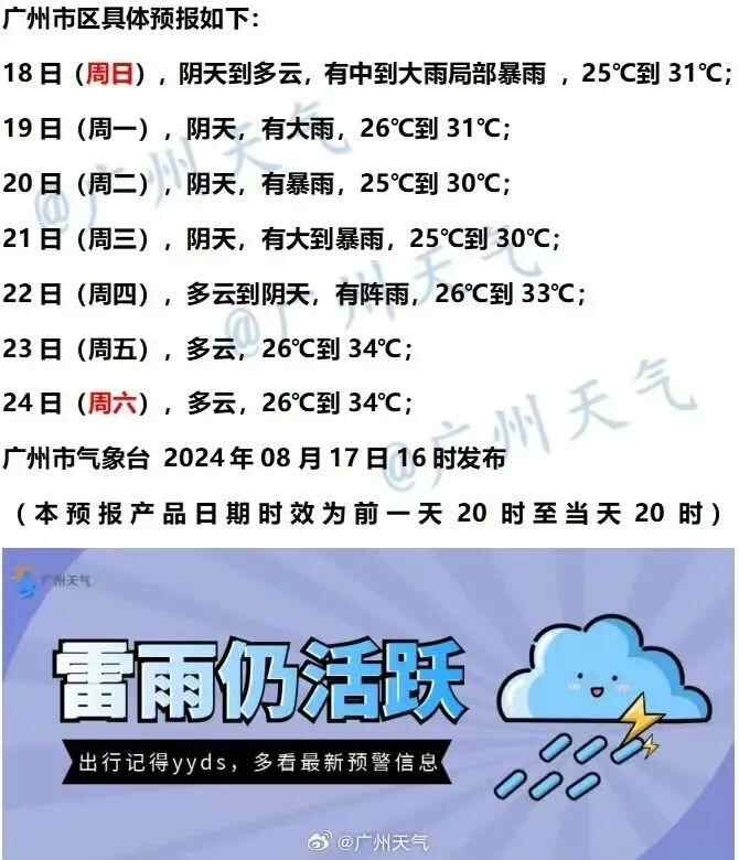 根据广州市气象台8月17日傍晚预计,18日低涡东移,广州仍有中到大雨,19-21日受高空槽和西南季风共同影响,雨势进一步加强,广州将有一次暴雨天气过程。按现有气象资料展望,22日起高空槽东移,广州高度场加强,降水减弱,转多云阵雨天气,气温升高。