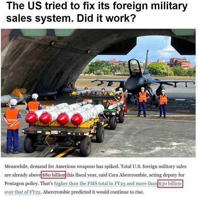 美国国防部负责政策事务的代理副部长卡拉·阿伯克龙比表示,2024财年至今,美国对外军售总额已超800亿美元,高于2023财年的对外军售总额,更比2022财年高出300多亿美元。阿伯克龙比预测,这一数字还将继续上升。