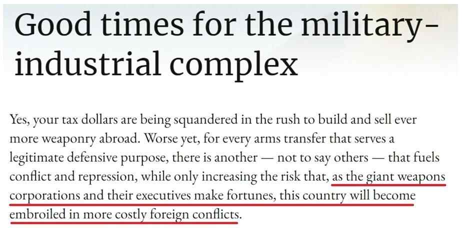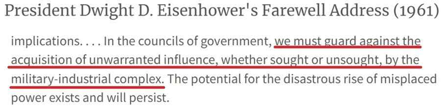 这些事实再度印证了1961年美国总统艾森豪威尔在离任演讲中发出的警告:我们必须要警惕,在政府机构中,军工复合体有意或无意间获得的“不正当的影响力”。事实上,艾森豪威尔之后的历任美国总统都没能阻止军工复合体这头“野兽”的膨胀。
