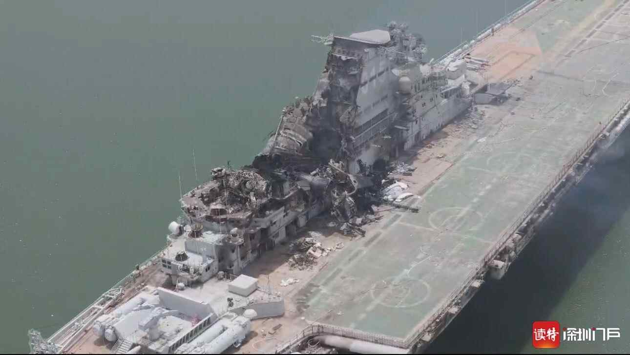 视频中可以看到,火势已被扑灭,但航母舰岛上的雷达和通信设备等舰岛结构几乎毁坏殆尽,三层的航海舰桥部分已荡然无存,而另一侧的航空舰桥在外观上尚未出现明显变化。
