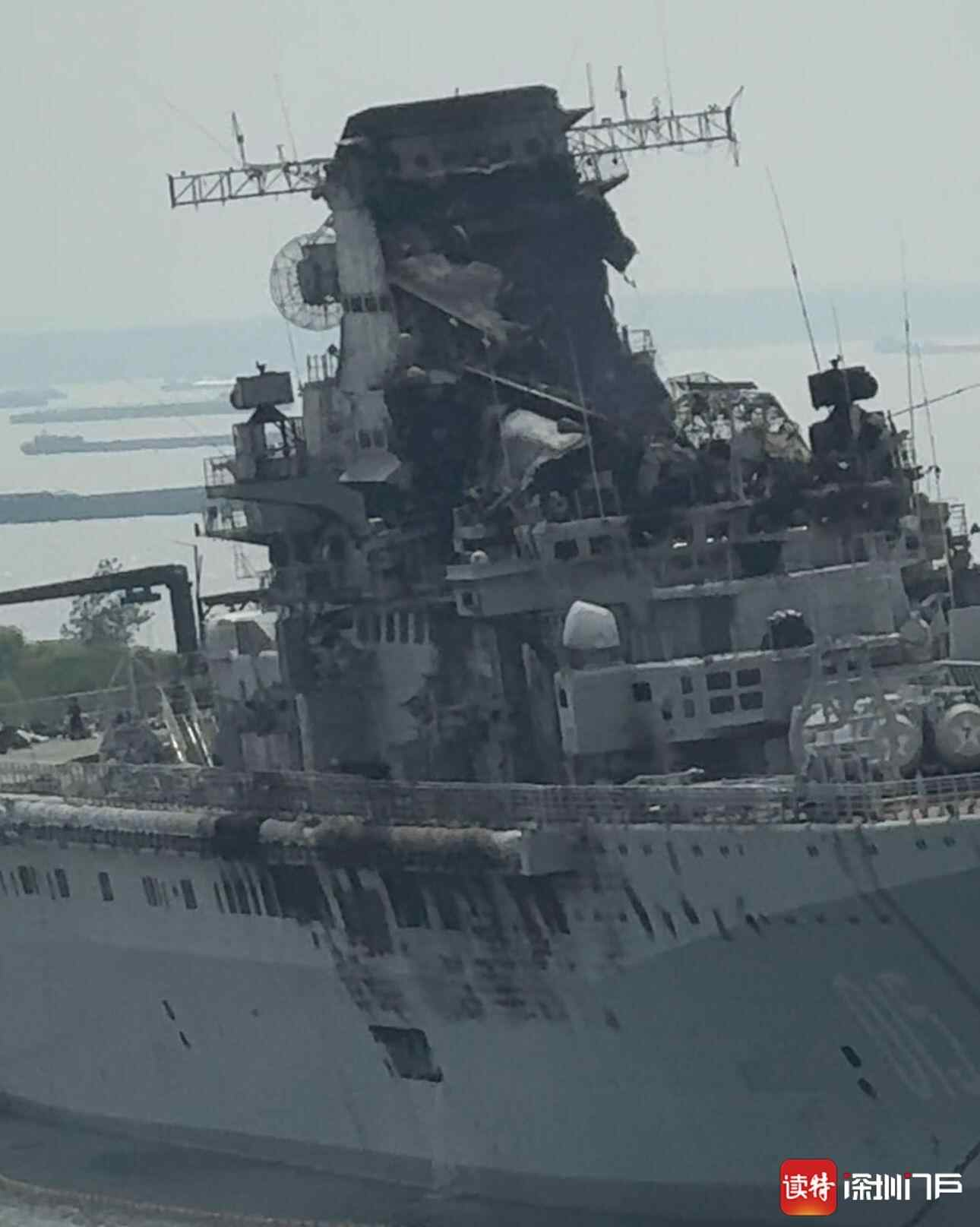 8月17日,读特新闻记者连线多位目击者了解到,现场火势已扑灭,但航母舰岛烧毁严重。