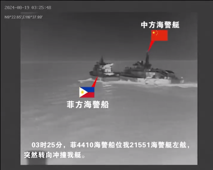中国海警局新闻发言人甘羽表示,8月19日,菲律宾4410、4411号海警船未经中国政府允许,非法闯入中国南沙群岛仙宾礁邻近海域,中国海警依法对菲船只采取管控措施。3时24分,菲4410号船无视中方多次严正警告,以不专业、危险方式,故意冲撞中方正常维权执法的21551艇,导致发生擦碰,责任完全在菲方。