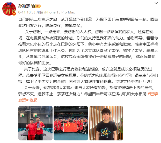 赛后孙颖莎在社交账号发文,总结巴黎奥运会“来自大家所有的爱,都是我继续走下去的勇气。梦想不灭,追梦不止,莎莎还会努力!希望四年后可以在洛杉矶和大家相见!”