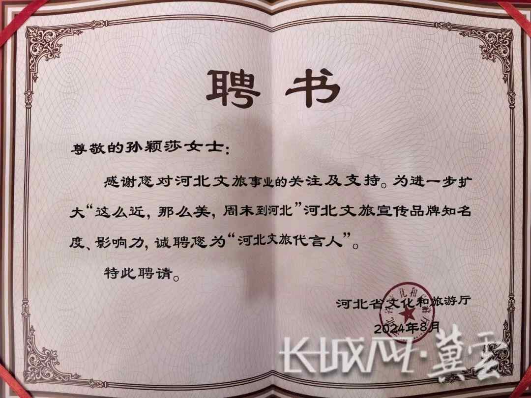 日前,河北省文化和旅游厅聘请中国女子乒乓球运动员、奥运冠军孙颖莎为“河北文旅代言人”。