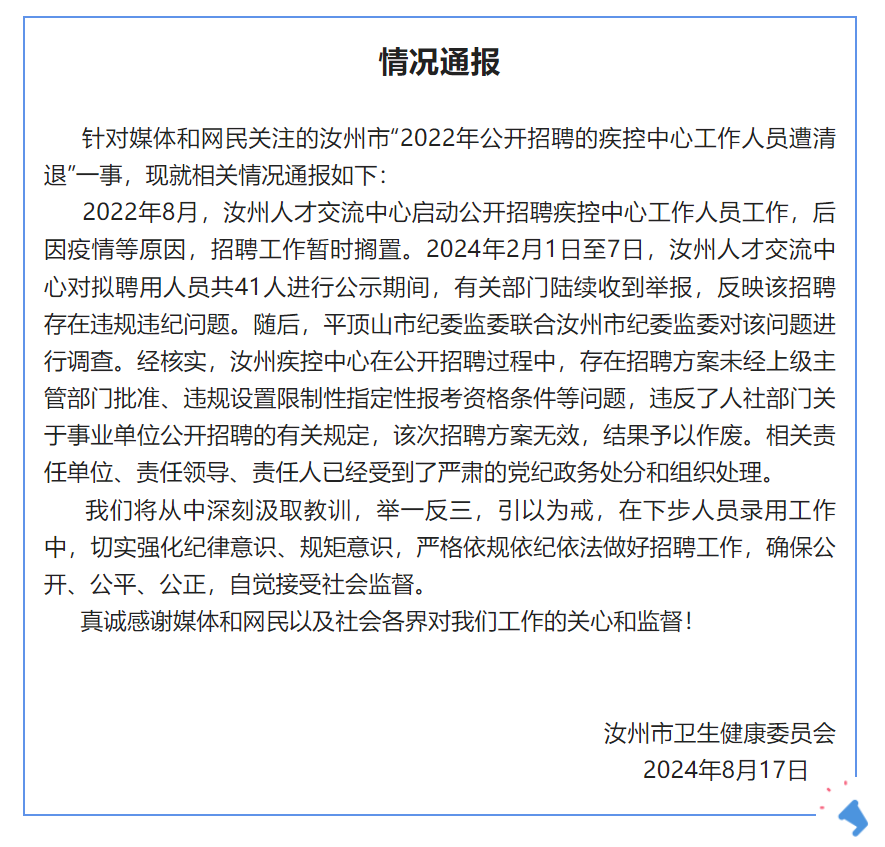 8月17日下午,汝州市卫生健康委员会发布通报称,汝州市疾控中心在招聘过程中,未获得上级主管部门批准,且违规设置了限制性报考资格条件,违反了人社部门关于事业单位公开招聘的相关规定。因此,该次招聘方案被判定为无效,招聘结果作废。相关责任单位和责任人因违规行为,受到了严肃的党纪政务处分和组织处理。