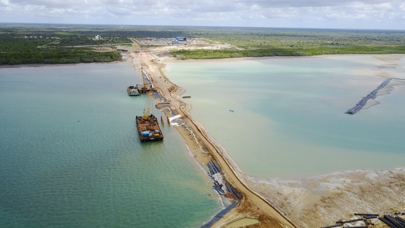 2017年5月在肯尼亚东北部曼达湾海域拍摄的拉穆港项目的引堤。引堤将大陆与人造陆地连在一起。(图源:新华社)