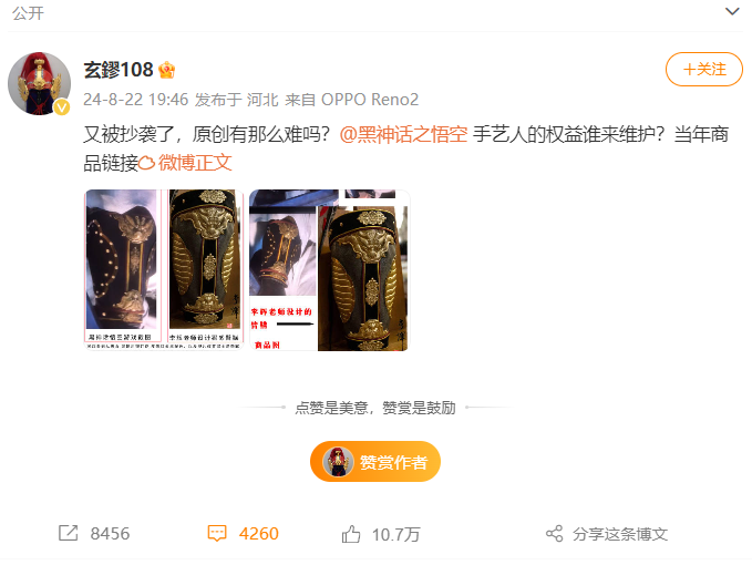 22日19时许,博主@玄鏐108直言被抄袭,并附上了图和链接:又被抄袭了,原创有那么难吗?手艺人的权益谁来维护?