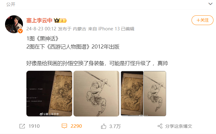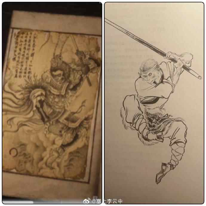23日凌晨,博主@塞上李云中发布微博,将《黑神话:悟空》中的“大圣残躯”篇的图片,与其在2012年出版的《西游记人物图谱》中的孙悟空姿势进行了对比,称“好像是给我画的孙悟空换了身装备,可能是打怪升级了 ,真帅”。