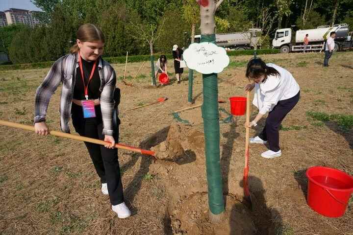 4月20日,美国马斯卡廷中学学生与石家庄外国语学校学生在河北正定的“中美友谊传承青年林”共同植树。新华社记者 张粲 摄