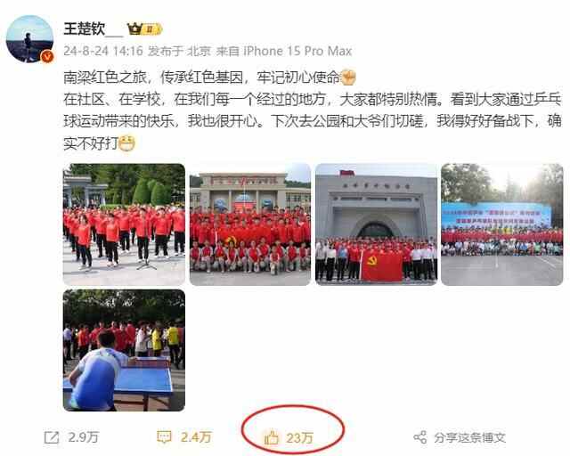 结束甘肃之旅,回到北京后,王楚钦发微博文称,“下次去公园和大爷们切磋,我得好好备战下,确实不好打!”截至发稿,相关微博点赞量已破23万!
