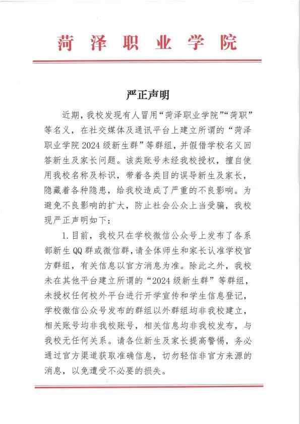 近期,我校发现有人在微信、QQ、抖音、小红书、快手等网络平台上,出现“日照职业技术学院表白墙”“日照职业技术学院万能墙”等账号,个别账号假借我校名义建立“24级新生答疑群”“24级新生入学群”等类似群组。该类账号未获我校授权,擅自使用学校名称及标识,存在广告营销和信息失实等各种风险,给我校造成严重的不良影响。为避免不良影响的扩大,防止社会公众上当受骗,我校现严正声明如下: