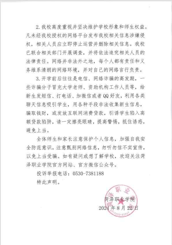 二、山东劳动职业技术学院始终高度重视并坚决维护学校形象和师生权益。对于任何未经我校授权的网络平台发布的我校相关信息,我校将视为侵权行为,并保留依法追究其法律责任的权利。我们呼吁广大师生、家长及社会各界,共同抵制网络谣言,维护健康的网络舆论环境,对自己的言论负责。