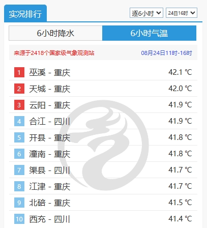 今天白天,高温遍布全国多个省份,主要集中在四川、重庆、湖北、湖南、江西、安徽、浙江、江苏、河南、山东、福建、广东等地。其中,高温火力最猛的地方还是在四川盆地一带。截至16时,川渝两地包揽全国高温排行榜前十名,并且都在41℃以上,重庆巫溪最高达42.1℃。出伏仿佛出了个寂寞。