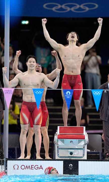 中国队选手获得巴黎奥运会游泳男子4x100米混合泳接力冠军后庆祝(2024年8月4日摄)。新华社记者 杜宇 摄