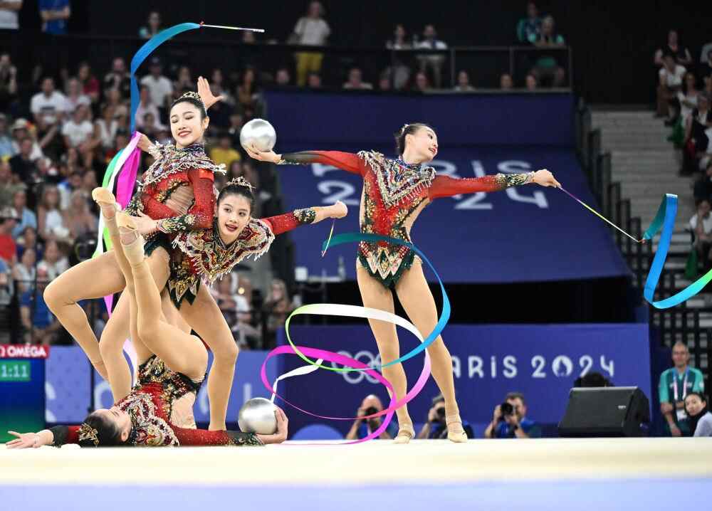 中国队在在巴黎奥运会艺术体操项目集体全能决赛中获得冠军(2024年8月10日摄)。新华社记者 程敏 摄