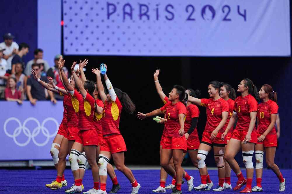中国队选手获得巴黎奥运会女子橄榄球第六名后向观众致意(2024年7月30日摄)。新华社记者 许畅 摄