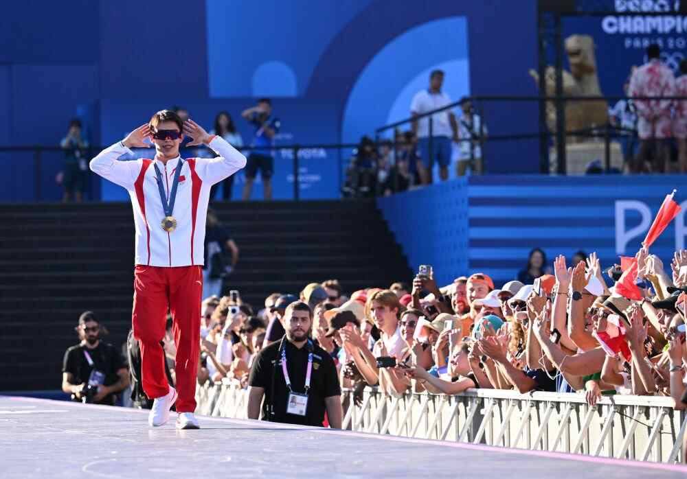 巴黎奥运会跳水男子双人三米板金牌得主、中国选手龙道一在冠军公园与观众互动(2024年8月5日摄)。新华社记者 贺灿铃 摄