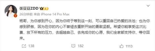 8月25日9时,孙杨的妻子、中国艺术体操队员张豆豆在社交平台上发文写道:“杨哥,为你感到开心,因为你终于等到这一刻,可以重回自己热爱的泳池;也为你感到骄傲,因为在你的内心不曾褪去重新开始的勇敢坚毅。希望你能享受这次比赛,放下所有的压力,去超越自己,去完成你的心愿,我们全家都支持你,等你回来。”