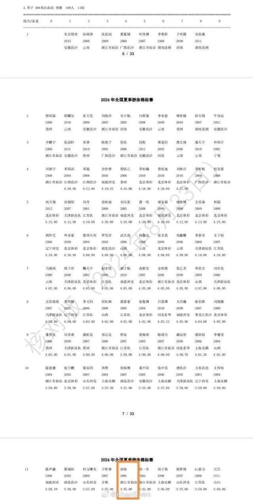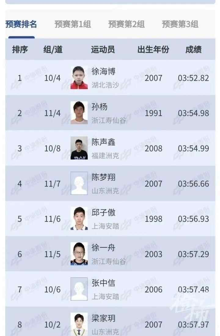 根据此次赛事秩序册各队伍报名名单显示,1991年出生的孙杨是年纪最大的。他的报项成绩3分45秒,是所有运动员报项成绩中最好的,3分45秒即便在2024年全国男子400米自由泳的成绩中,也是数一数二的。