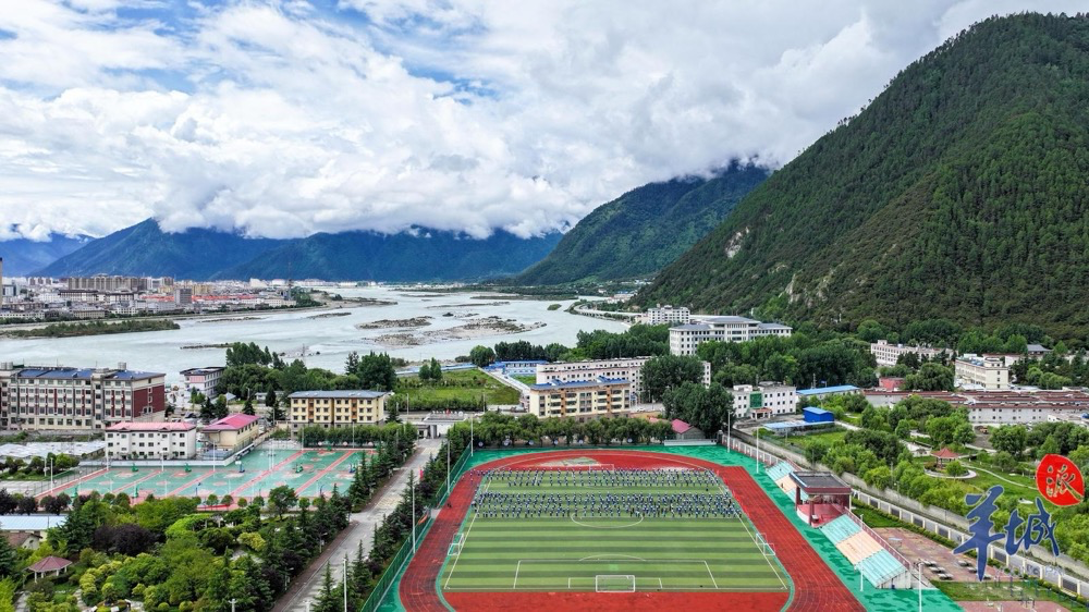 7月7日,林芝市第一中学,学生们在操场上做操跳舞