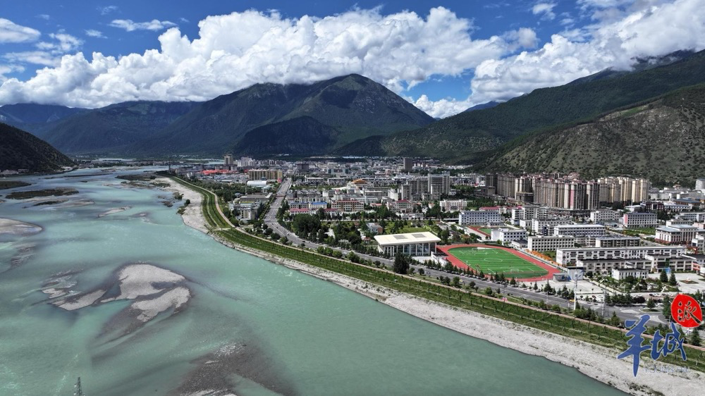 林芝的蓝天、白云和青山相互映衬,如同一幅精美的画卷