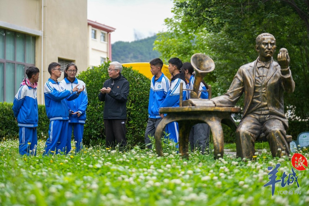 7月7日,林芝市第一中学,援藏教师姚勇文(左四)在校园里与学生们交谈