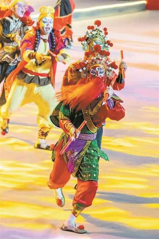 表演过程中,梁山好汉的扮演者不断做出种种迅捷而刚猛的动作,既有单人动作,也有双人对拆和多人协同动作,配合着舞者风格鲜明的脸谱,表现上阵前热血沸腾、跃跃欲试的战斗气氛,极尽威武凶悍的雄性之美。