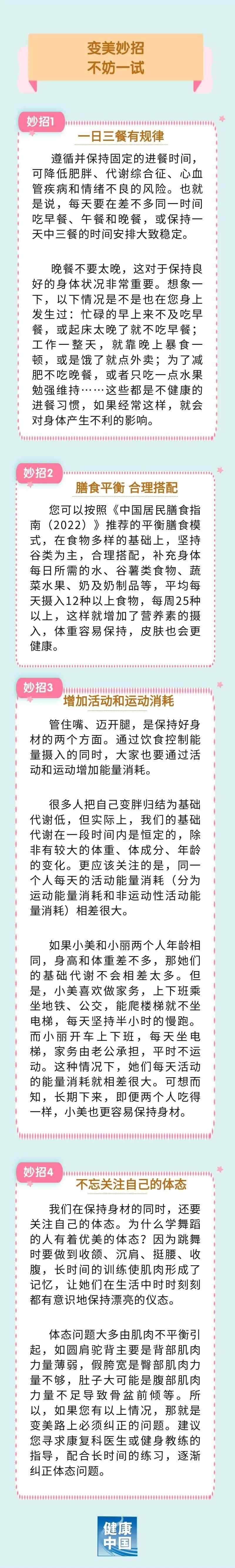 爱美之心,人皆有之。现如今,我们追求的美更加多元,不只是外在容貌和形体上的美,内在思想、品德、理想、修养、认知散发的美,也是大家追求的目标。内在的美需要通过一定的人生历练逐渐获得,外在美则只需要我们保持健康的生活方式。即便没有精致的五官和绝佳的身材比例,紧致的皮肤、光泽的头发、正常的体重、良好的体态,也会让人散发健康之美。