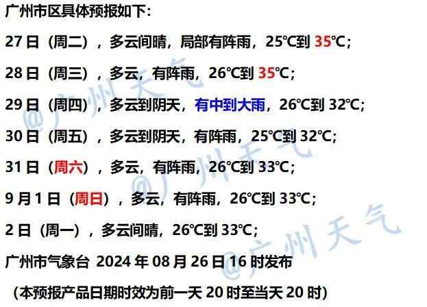 29日,多云到阴天,有中到大雨,气温26到32℃。