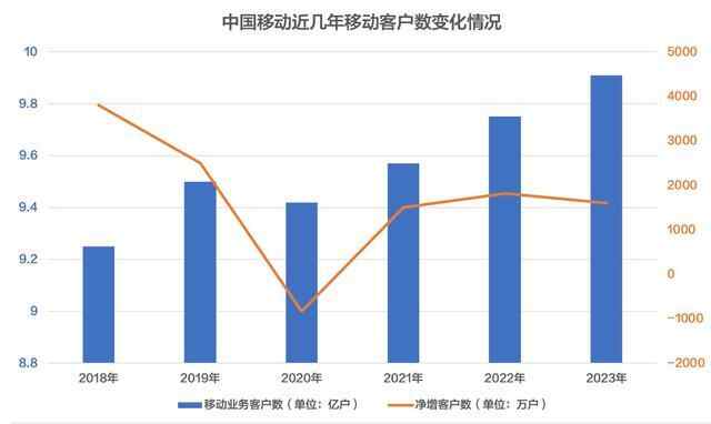 当前,移动用户增长放缓,市场日趋饱和,运营商之间继续激烈竞争。以中国移动为例,2018年—2023年,其移动客户数分别为9.25亿、9.50亿、9.42亿、9.57亿、9.75亿、9.91亿,年净增客户分别为3800万、2500万、-836万、1497万、1811万、1599 万户。虽然移动客户数整体上仍在增长,但年净增客户数总体呈下降放缓趋势。其它两家运营商情况亦然。