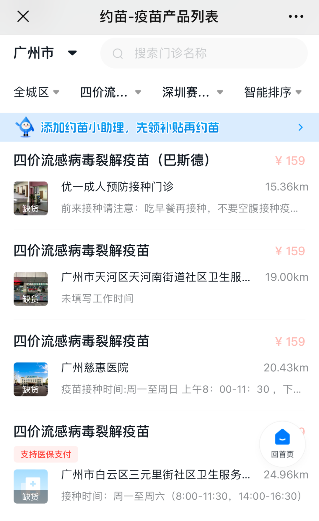 羊城晚报记者注意到,在“约苗”小程序上,除了个别医院,目前,广州绝大多数社区医院均显示巴斯德疫苗“缺货”。