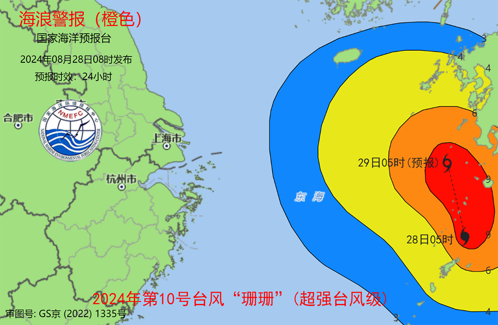 受今年第10号台风“珊珊”(超强台风级)的影响,预计8月28日中午到29日中午,东海东部将出现6米到9米的狂浪到狂涛区,近海海域海浪预警级别为橙色。请在上述海域作业的船只注意安全,沿海各有关单位提前采取防浪避浪措施。