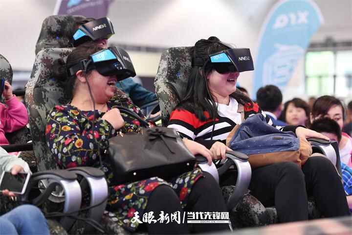 2018年贵阳数博会上,体验者搭乘VR视界置身虚拟现实的惊险世界。由VR全景视觉搭配动感特效平台,带来真实临场感受,现场尖叫声不断,感染力十足。李枫 摄