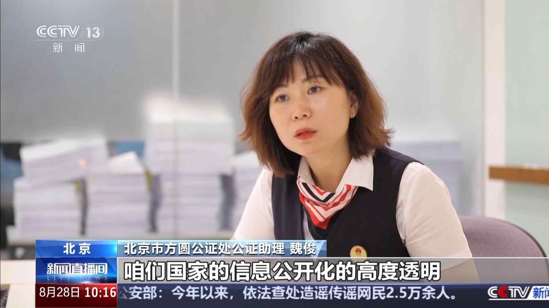 北京市方圆公证处公证助理 魏俊:咱们国家的信息公开化的高度透明,协助了我们很多工作的顺利进行。我们如果像以往通过打电话去当地核实,速度肯定不会这么快。