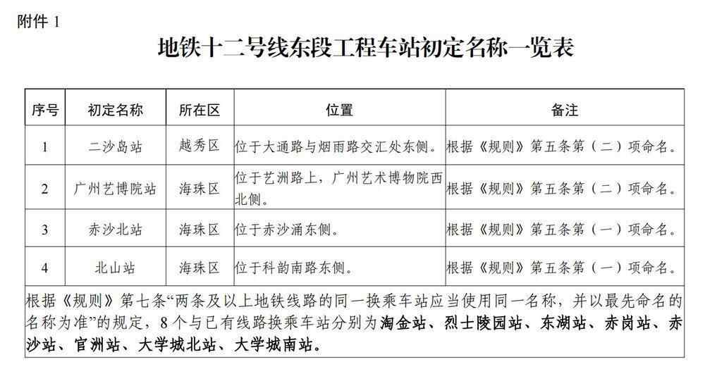 8月27日,广州市民政局发布关于征求地铁十二号线东段工程车站初定名称意见的公告,拟对地铁十二号线东段工程车站进行命名,4个新命名车站初定名称公开征求意见。