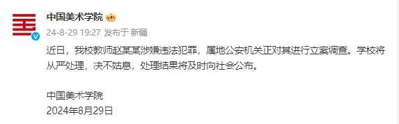 8月29日晚,中国美术学院发文表示:近日,我校教师赵某某涉嫌违法犯罪,属地公安机关正对其进行立案调查。学校将从严处理,决不姑息,处理结果将及时向社会公布。