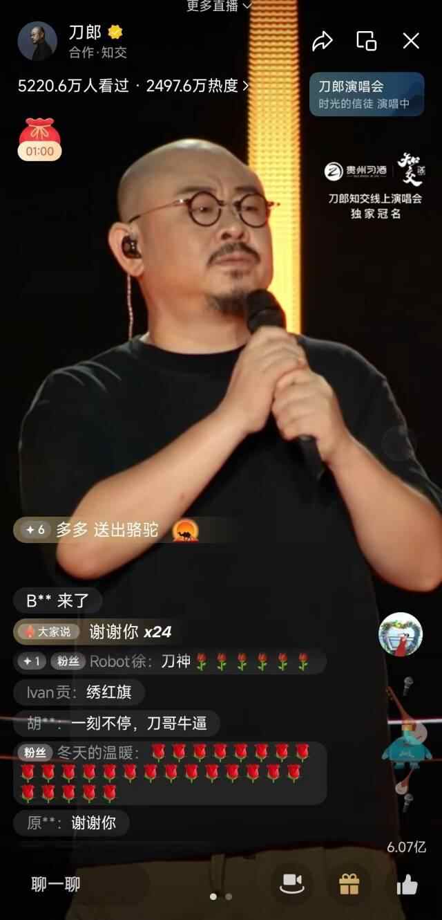 8月30日晚,《山歌响起的地方》刀郎线上演唱会在微信视频号举行,从20时开始到23时30分左右结束,3个多小时的演唱会共吸引超过5200万人观看,点赞超6亿。