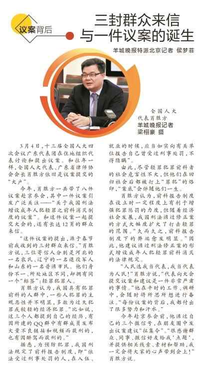 作为十三届全国人大代表,肖胜方曾连续两年提交议案,建议修改刑法,增设成年人犯轻罪的前科消灭制度。今年全国两会期间,来自广东的十四届全国人大代表朱征夫建议建立轻罪前科消除制度,这是他连续第四年在全国两会会场上提出这一建议。