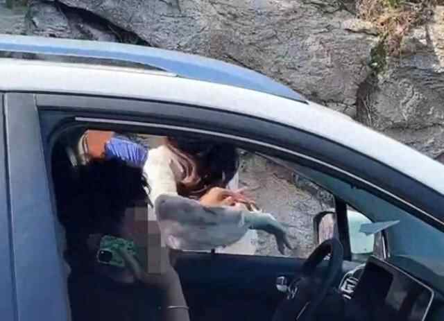 她回车上之后,交通疏导人员过来劝阻,问她为什么要逆行。她与工作人员争吵,推搡对方,又在倒车时与前方的旅游大巴车发生剐蹭,接下来的事情被旁边一位游客拍到,就是网传视频里那样。