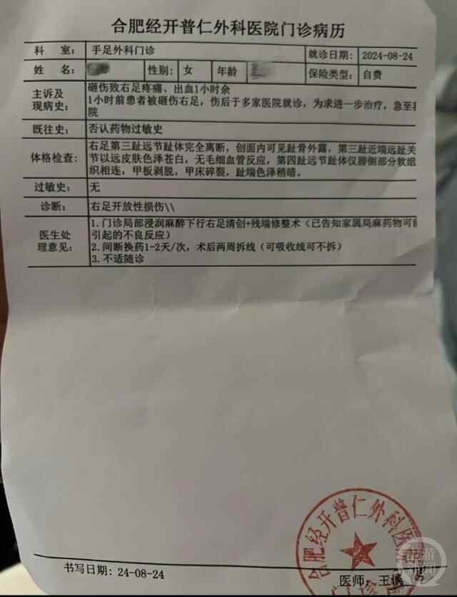 孙先生发来的门诊病历显示,其妻子8月24日前往该院手足外科门诊就医,检查结果为“右足第三趾远节趾体完全离断,创面内可见趾骨外露;第四趾远节趾体仅腓侧部分软组织相连,甲板剥脱,甲床碎裂,趾端色泽稍暗”,处理意见为“门诊局部浸润麻醉下行右足清创+残端修整术(已告知家属局麻药物可能引起的不良反应)”。由于担心伤及腹中胎儿,25日凌晨,孙先生带妻子前往安徽医科大学第二附属医院做了产检。门诊病历显示,主诉“孕34周+4天,高空掷物砸伤4小时有余”,检查结果显示,胎儿生命体征平稳。