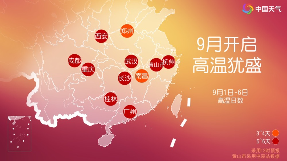 9月2日至3日,黄淮、江淮、江南东部高温逐渐消减,之后9月4日至5日高温又会向东扩张。预计未来10天,四川盆地、江汉、江南、华南等地高温日数将有5~10天,其中四川、重庆、湖北、湖南、江西、浙江等部分地区最高气温可达40℃~43℃。